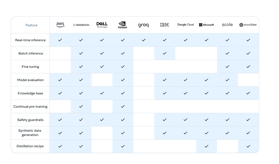Aquí es donde el ecosistema Llama puede ayudar. Desde el primer día, los desarrolladores pueden aprovechar todas las funciones avanzadas del modelo 405B y empezar a construir inmediatamente. Los desarrolladores también pueden explorar flujos de trabajo avanzados como la generación de datos sintéticos fáciles de usar, seguir instrucciones preparadas para la destilación de modelos y habilitar RAG continua con soluciones de socios como AWS, NVIDIA y Databricks. Además, Groq ha optimizado la inferencia de baja latencia para implementaciones en la nube, y Dell ha logrado optimizaciones similares para sistemas locales.