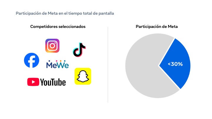 Para que la FTC gane este caso, necesita probar, por un lado, que Meta tiene una participación dominante en un mercado definido correctamente y que incluya a todos los competidores, y por otro, que esas adquisiciones perjudicaron a la competencia y a los consumidores. La FTC está equivocada en ambas afirmaciones . Es por eso que creó un mercado ficticio en el que Facebook e Instagram compiten solo con Snapchat y una aplicación llamada MeWe. En realidad, las personas pasan más tiempo en TikTok y en YouTube que en Facebook o Instagram. Con solo añadir TikTok y YouTube a la definición de mercado de redes sociales de la FTC, Meta tiene una participación inferior al 30%.
