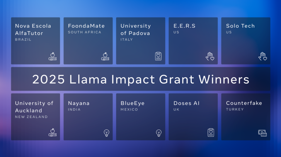 Las Llama Impact Grants están destinadas a fomentar la innovación y crear oportunidades económicas a través de la IA de enfoque abierto. Hoy, estamos emocionados de anunciar a los 10 destinatarios internacionales de la segunda edición de las Llama Impact Grants. Con más de 1,5 millones de dólares otorgados a 10 destinatarios internacionales, estas subvenciones apoyan a empresas, startups y universidades que utilizan Llama para impulsar cambios transformadores. Los ganadores de este año muestran una diversa gama de soluciones, incluyendo E.E.R.S. de Estados Unidos, que utiliza un chatbot impulsado por Llama para mejorar el acceso público a los servicios cívicos, y Doses AI en el Reino Unido, que transforma las operaciones de farmacia con detección de errores en tiempo real. Otros ganadores destacados incluyen Solo Tech, que proporciona soporte de IA offline en comunidades rurales de EE.UU., y FoondaMate, una herramienta de estudio multilingüe que ayuda a millones de estudiantes en África y más allá.