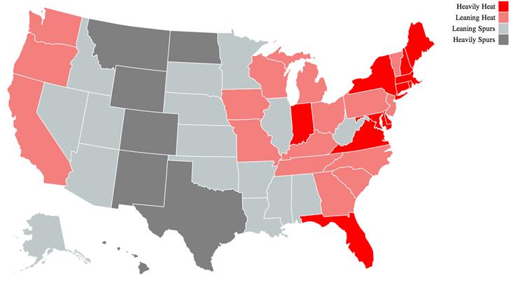 Miami had more mentions than San Antonio across the U.S. as a whole, dominating states east of the Mississippi and the West Coast, as evidenced by the red and pinkish hues on the map. Taking a look at the dark-and-light grays, the Spurs managed to nail down Texas and a large swath up through the Great Plains.