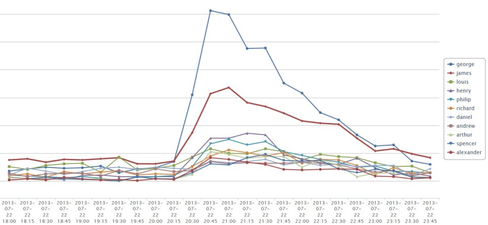 What to name the new prince was a big topic of conversation following the birth, and British Facebook users seemed to have a crystal ball. Facebook looked at the most popular boy names buzzing in the UK on Monday, and found that “George” was at the top of the list. In fact, Brits on Facebook mentioned the name George 30% more than the second most popular name, James. Here is the complete list: