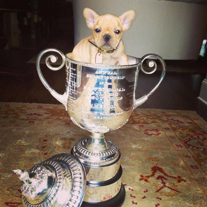 Finally, on Thursday, he showed off two prized possessions on Facebook. “The two newest additions to the Dufner household,” he writes, “The Wanamaker trophy and Prince Louie!”