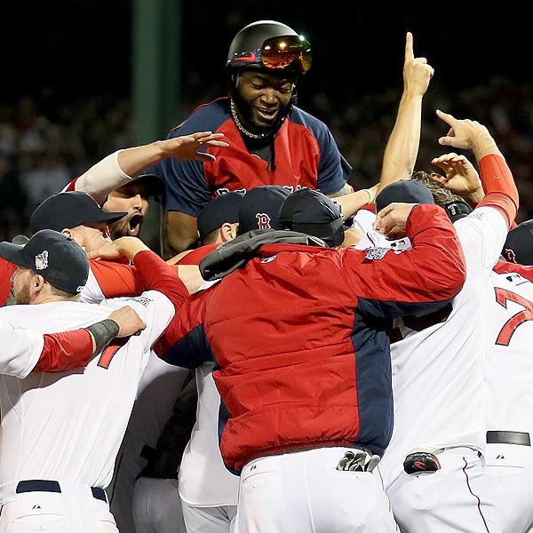 World Series MVP David Ortiz is hoisted by his Red Sox teammates. Major League Baseball posted this photo with the hashtag #MVPapi