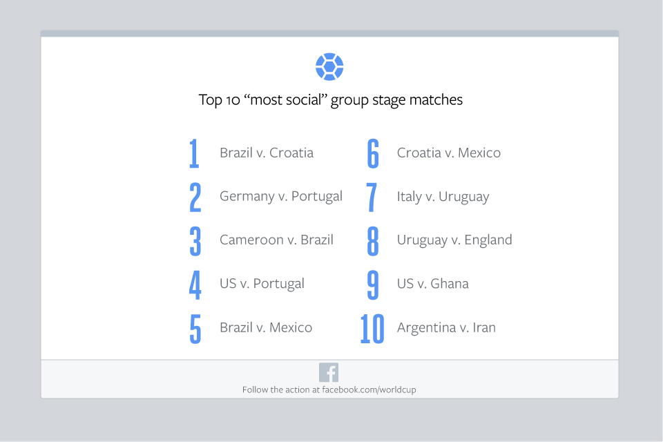 Facebook’s data team looked at the volume of global conversation around the entire World Cup Group Stage, from June 12-26, along with the most social matches, most social goals, countries and most-talked-about players.