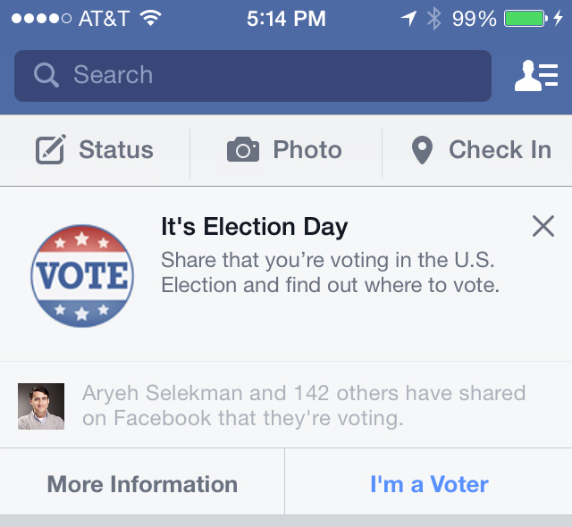Today, people in the US on Facebook who are over 18 will see a message at the top of their News Feed reminding them that it’s Election Day and encouraging them to share with their friends that they’ve voted.