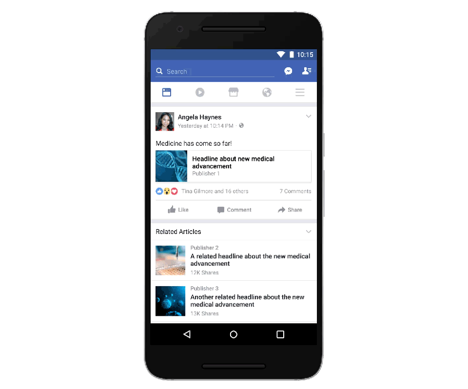 Today, we’re beginning to test Related Articles that might appear before you read an article shared in News Feed. These additional articles, which appear for topics many people are talking about on Facebook, will appear in a unit below the link. That should provide people easier access to additional perspectives and information, including articles by third-party fact checkers.