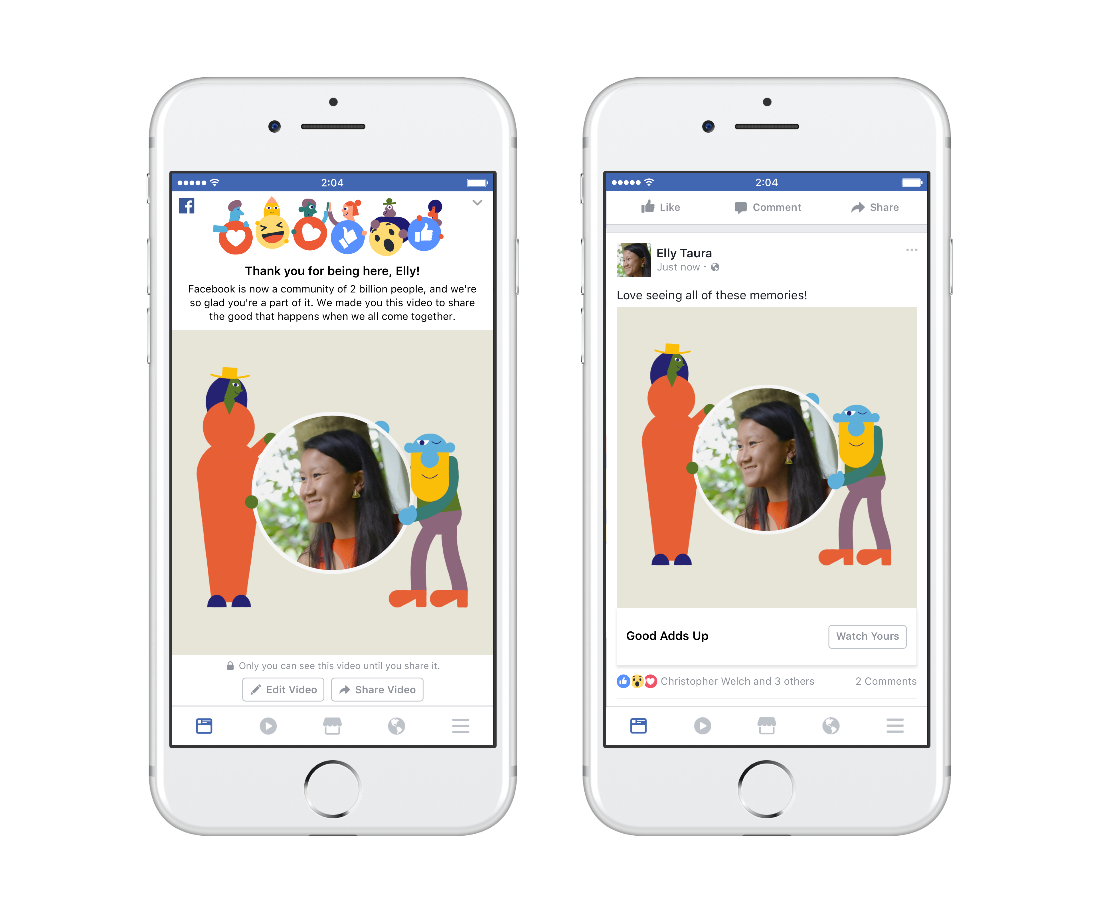 We are launching a personalized video to celebrate bringing the world closer together. You may see your video in your News Feed or by visiting facebook.com/goodaddsup.