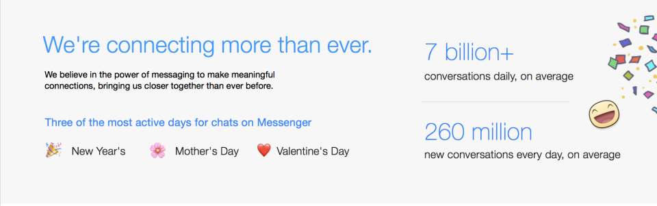 - On average, there are over 7 billion conversations taking place on Messenger every day in 2017.