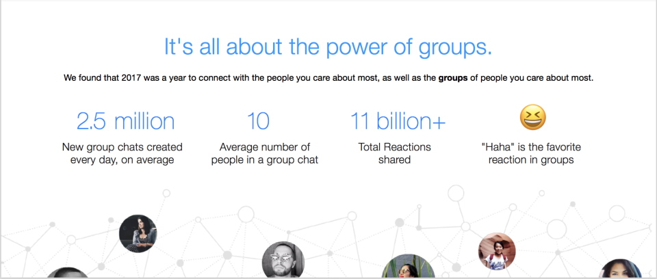 This year we introduced several new features to make group chats in Messenger more fun and useful, including @mentions, now it’s easy to jump right back in to the conversation to answer someone’s question or to provide a response, and reactions, giving you an option quickly showing acknowledgement or expressing how you feel in an easy way with an emoji. We found that 2017 was both a year to connect with the people you care about most, as well as the groups of people you care about most: