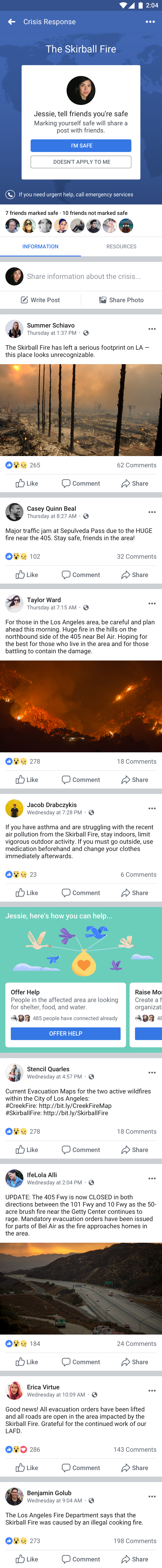 Last year we announced Crisis Response, a center on Facebook where people can get information about recent crises and access Safety Check, Community Help and Fundraisers. We’re always looking for ways to make it easier for people to support each other during a crisis, and people have told us that information from others is most helpful. Today we’re introducing a feature that will enable people affected by a crisis to share firsthand accounts of timely information, like road closures and damage photos and videos, making it easier to get real-time updates. The feature will be rolling out later this year.