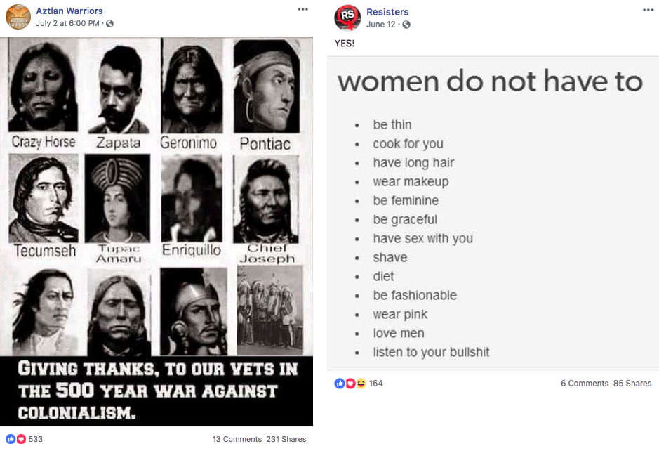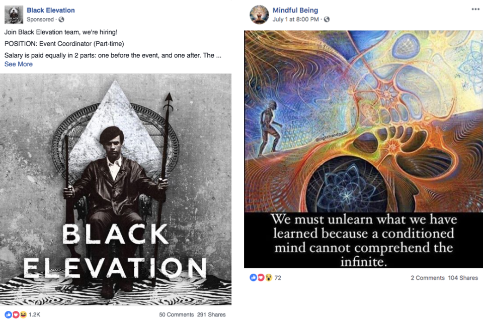 - The most followed Facebook Pages were “Aztlan Warriors,” “Black Elevation,” “Mindful Being,” and “Resisters.” The remaining Pages had between zero and 10 followers, and the Instagram accounts had zero followers.