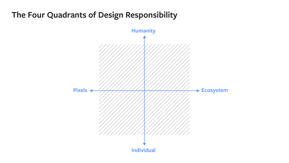 Designing at Facebook scale is enormously rewarding, and it’s also a huge responsibility. We must remember that all of us — as designers, as businesses, as an industry — have a broad responsibility to ensure that technology is built and deployed in service of humanity, and not the other way around. Designing for all four quadrants, thinking expansively about the impact of our inventions on people and society: these things are at the heart of ethically responsible design.