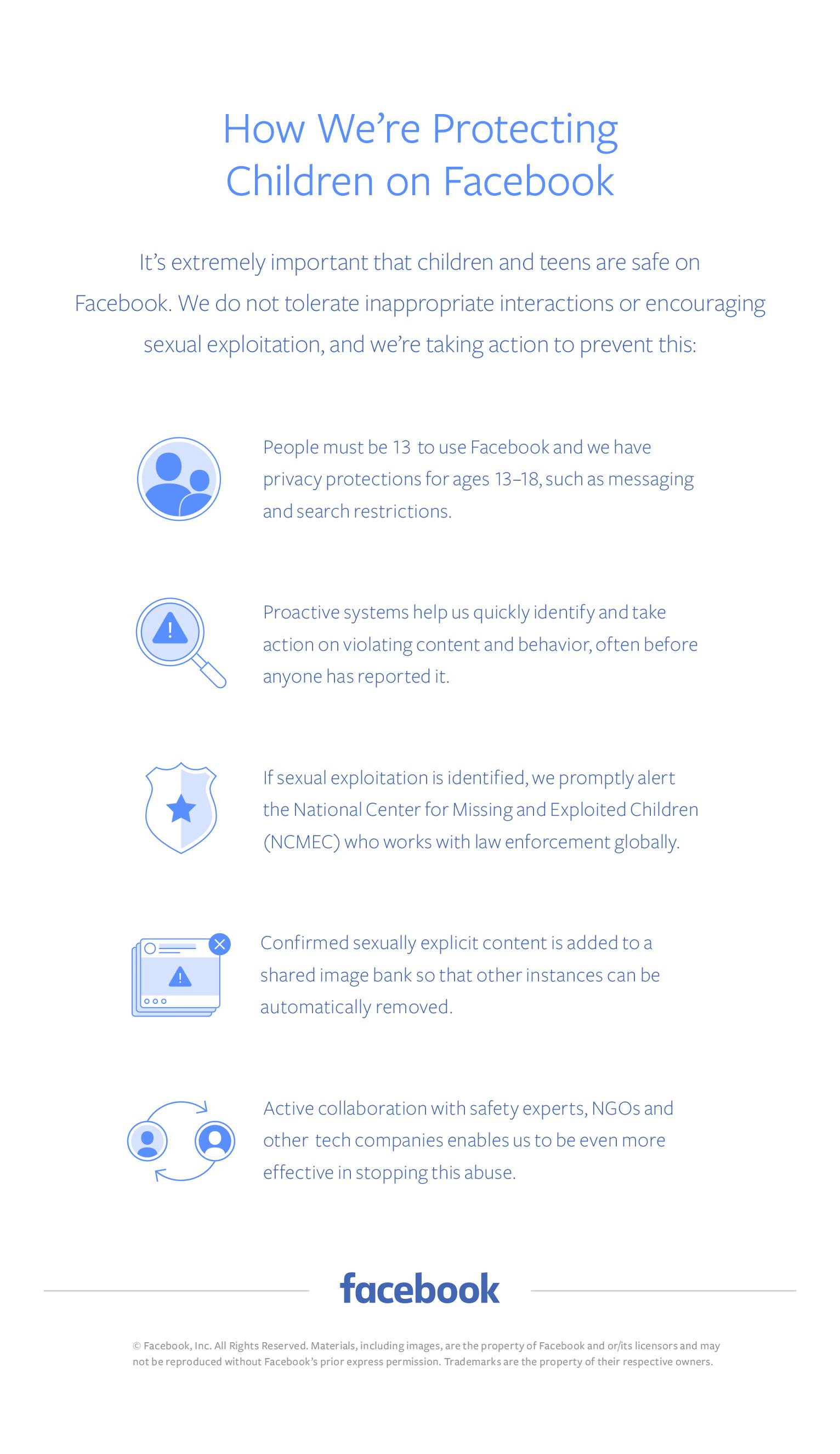 One of our most important responsibilities is keeping children safe on Facebook. We do not tolerate any behavior or content that exploits them online and we develop safety programs and educational resources with more than 400 organizations around the world to help make the internet a safer place for children. For years our work has included using photo-matching technology to stop people from sharing known child exploitation images, reporting violations to the National Center for Missing and Exploited Children (NCMEC), requiring children to be at least 13 to use our services, and limiting the people that teens can interact with after they sign up.