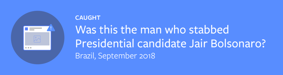 Our machine learning model identified this photo as being potentially false, and Brazilian fact-checker Aos Fatos reviewed the photo. They determined that the man pictured was not the attacker and that the event depicted was not in Juiz de Fora.