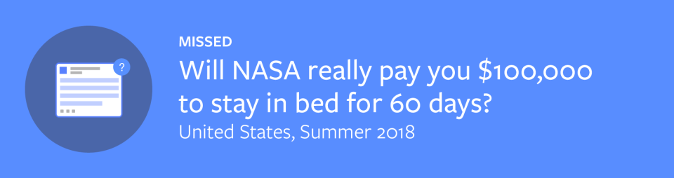 This story, published by the website World Facts FTW, claimed that NASA was looking to compensate volunteers up to $100,000 to participate in 60-day “bed rest studies.” The headline certainly seemed enticing — the post racked up millions of views on Facebook.