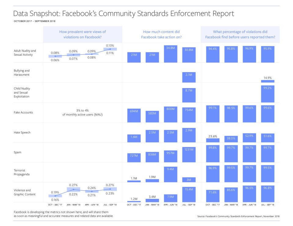 Today, we’re publishing our second Community Standards Enforcement Report. This second report shows our enforcement efforts on our policies against adult nudity and sexual activity, fake accounts, hate speech, spam, terrorist propaganda, and violence and graphic content, for the six months from April 2018 to September 2018. The report also includes two new categories of data — bullying and harassment, and child nudity and sexual exploitation of children.