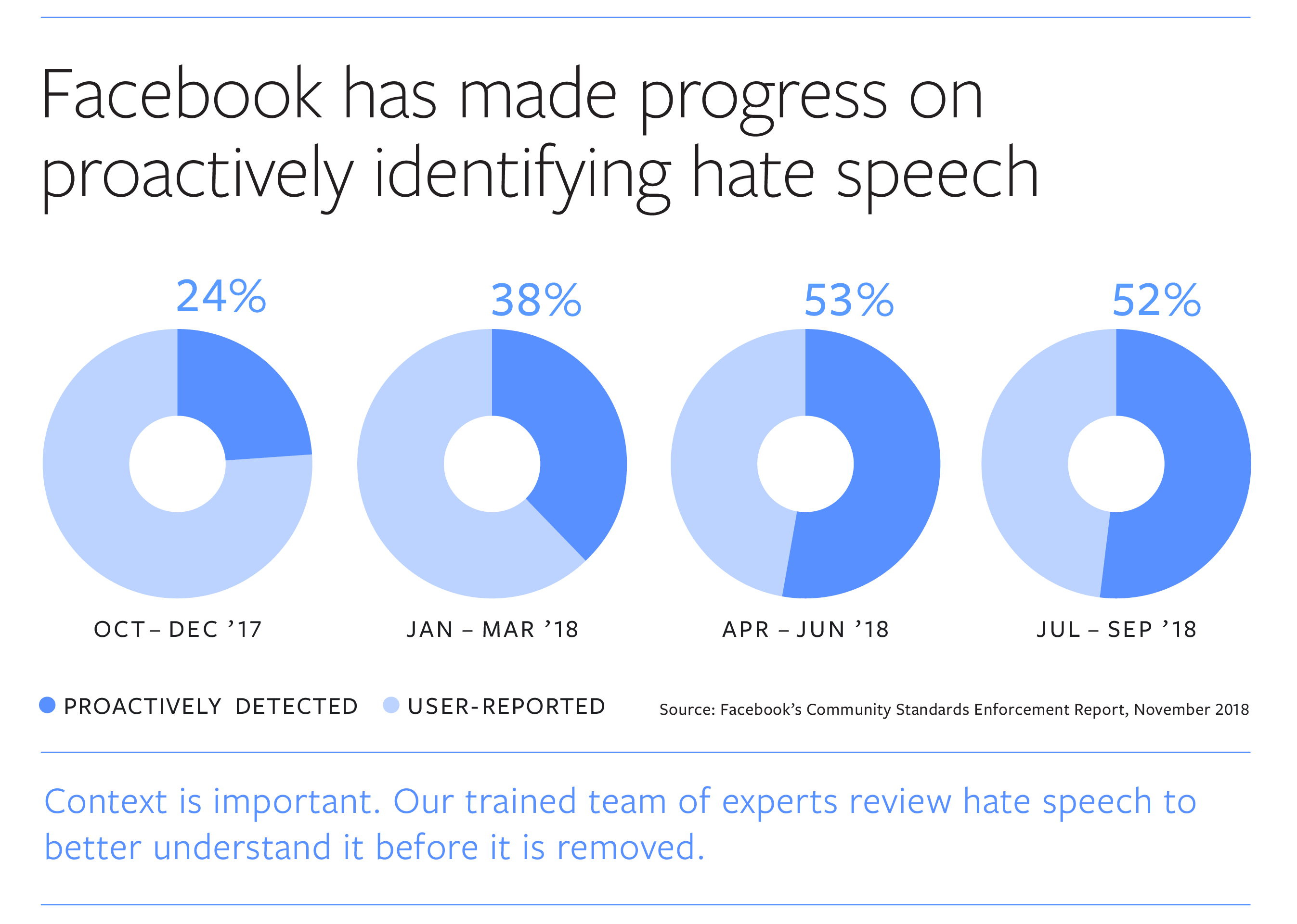 (Updated above graph on November 19, 2018 at 10:30AM PT to correct percent of hate speech proactively identified between January and March 2018.)