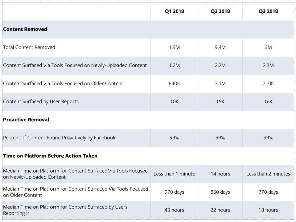 In short, our overall enforcement effort was significantly better in Q2 2018 than it was previously, even though our median time to take action was 14 hours. By Q3 2018, the median time on platform decreased to less than two minutes, illustrating that the new detection systems had matured.