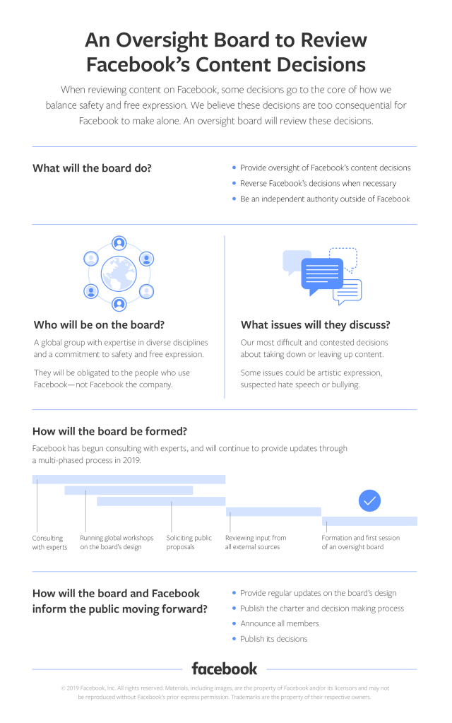 We look forward to getting additional input in how best to build a board that creates accountability and oversight of our content policy and enforcement decisions and will continue to share milestones and progress.