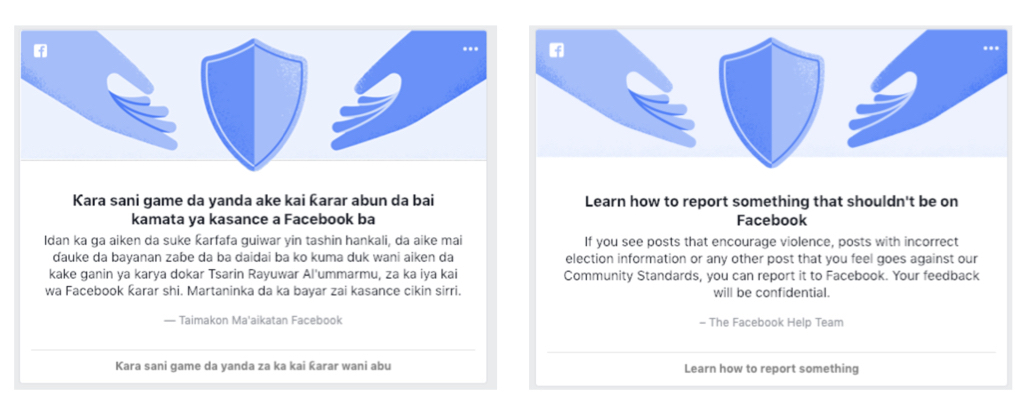 Helping to build informed and civically engaged communities is central to our work around elections. In Nigeria, we’ve rolled out new options in English & Hausa so people can report posts that contain incorrect election information, encourage violence or otherwise violate our Community Standards. On Election Day, we’ll show a voting day reminder in English and Hausa at the top of Facebook’s News Feed.