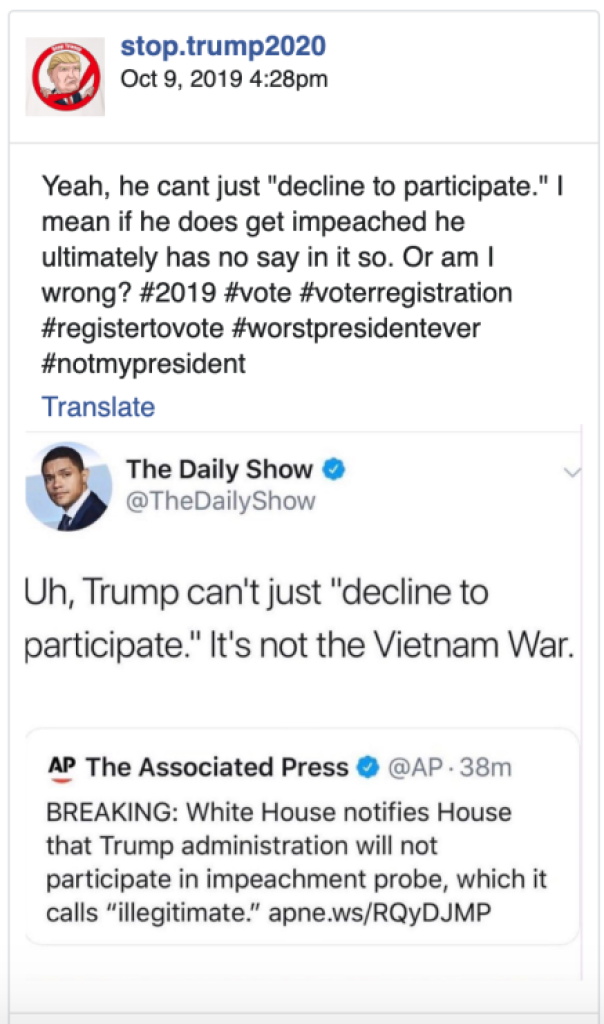 Finally, we removed 50 Instagram accounts and one account on Facebook that originated in Russia and focused primarily on the US. This campaign showed some links to the Internet Research Agency (IRA) and had the hallmarks of a well-resourced operation that took consistent operational security steps to conceal their identity and location. As we’ve seen before, this appears to have made it difficult for many of these accounts to build the following among authentic communities. The people behind this activity used fake accounts — some of which were previously detected and disabled by our automated systems as inauthentic and engaged in spam. These accounts followed, liked and occasionally commented on others’ posts to increase engagement on their own content. They primarily reused content shared across internet services by others, including screenshots of social media posts by news organizations and public figures. A small portion of these accounts also repurposed and modified old memes originally posted by the IRA. The people behind this operation often posted on both sides of political issues including topics like US elections, environmental issues, racial tensions, LGBTQ issues, political candidates, confederate ideas, conservatism and liberalism. They also maintained accounts presenting themselves as local in some swing states, and posed as either conservatives or progressives.