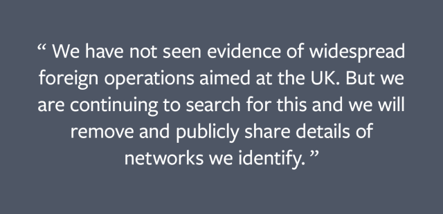 This team has not seen evidence of widespread foreign operations aimed at the UK. But we are continuing to search for this and we will remove and publicly share details of networks of CIB that we identify on our platforms.