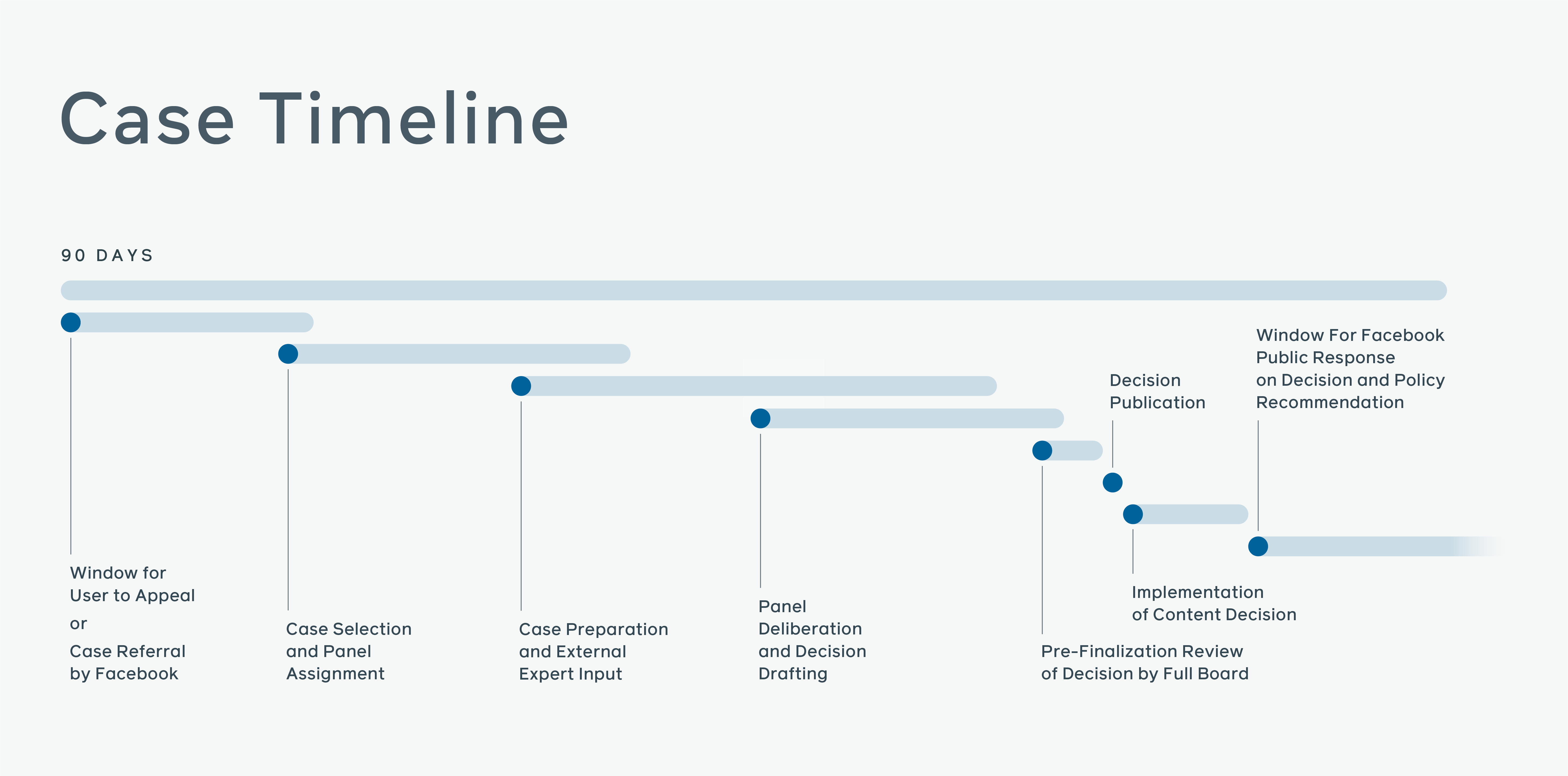 Given the large number of content decisions Facebook makes, as well as the time it will take to hear cases, we expect the board will choose cases that have the greatest potential to guide Facebook’s future decisions and policies. We expect the board to come to a case decision, and for Facebook to have acted on that decision, in approximately 90 days.