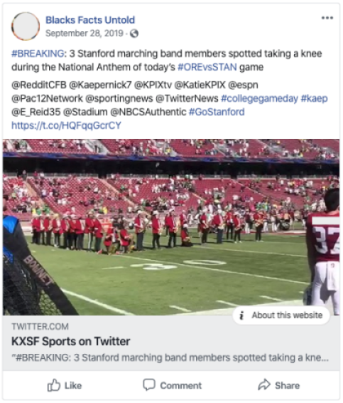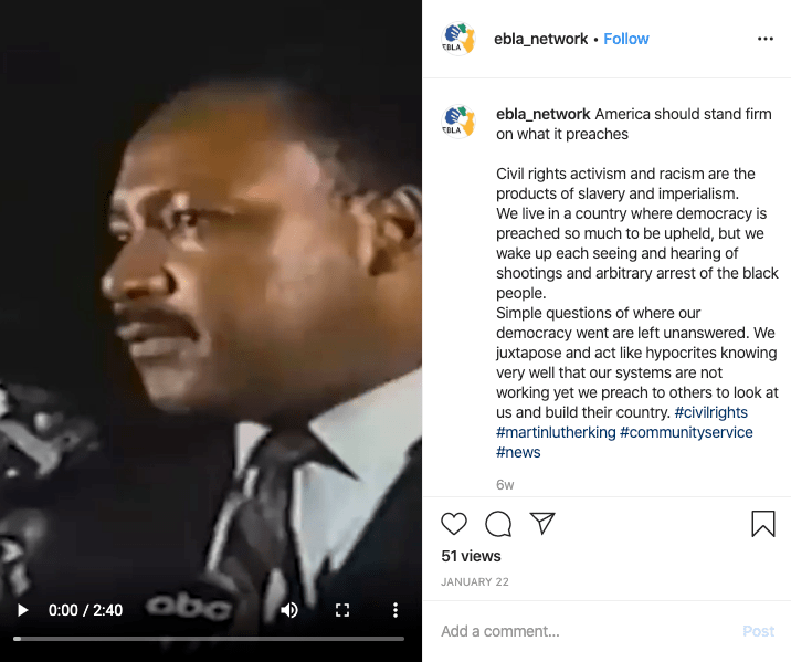 The people behind this network engaged in a number of deceptive tactics, including the use of fake accounts — some of which had already been disabled by our automated systems — to manage Pages posing as non-government organizations or personal blogs, and post in Groups. They frequently posted about US news and attempted to grow their audience by focusing on topics like black history, black excellence and fashion, celebrity gossip, news and events related to famous Americans like historical figures and celebrities, and LGBTQ issues. This activity did not appear to focus on elections, or promote or denigrate political candidates. They also shared content about oppression and injustice, including police brutality. Although the people behind this activity attempted to conceal their purpose and coordination, our investigation found links to EBLA, an NGO in Ghana, and individuals associated with past activity by the Russian Internet Research Agency (IRA).