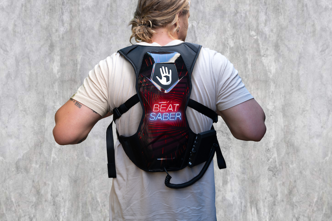 Dancer and choreographer Chris Fonseca plays a special version of Beat Saber while wearing the SUBPAC haptic feedback peripheral.