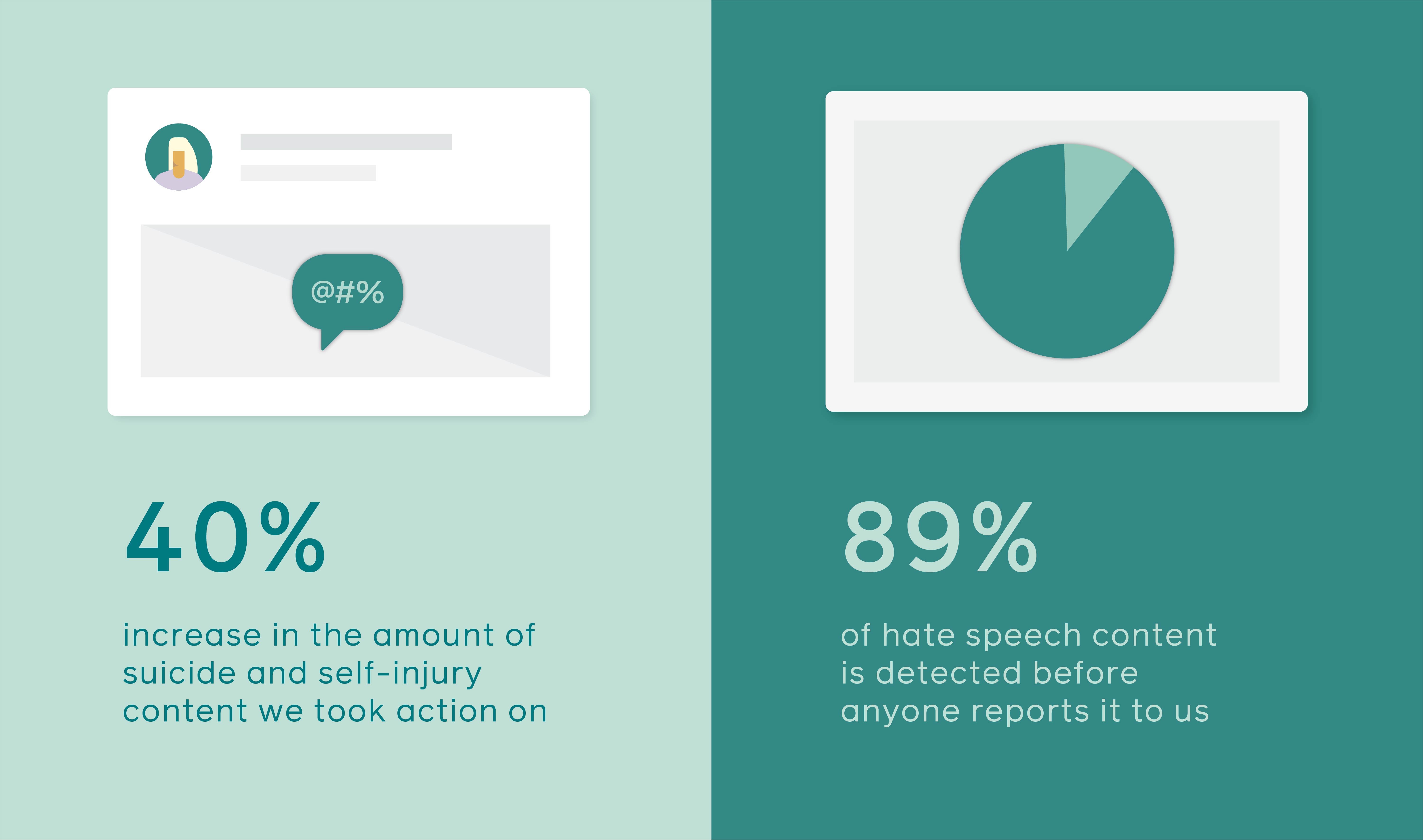 • On Instagram, we made improvements to our text and image matching technology to help us find more suicide and self-injury content. As a result, we increased the amount of content we took action on by 40% and increased our proactive detection rate by more than 12 points since the last report. We also made progress in our work combating online bullying by introducing several new features to help people manage their experience and limit unwanted interactions, and we announced new Instagram controls today. We are sharing enforcement data for bullying on Instagram for the first time in this report, including taking action on 1.5 million pieces of content in both Q4 2019 and Q1 2020.