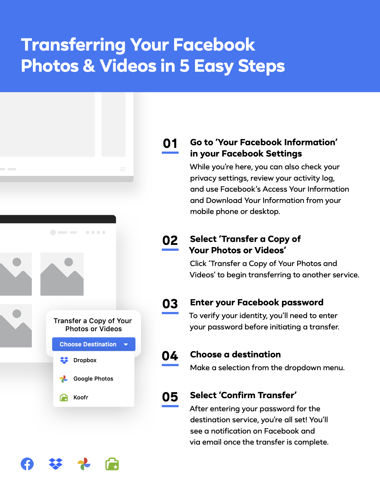 Our photo and video transfer tool is based on code developed through the open source Data Transfer Project. You can access this tool in Facebook settings within Your Facebook Information. From there, you can now select Dropbox or Koofr, in addition to Google Photos, and we plan to expand this list soon.
