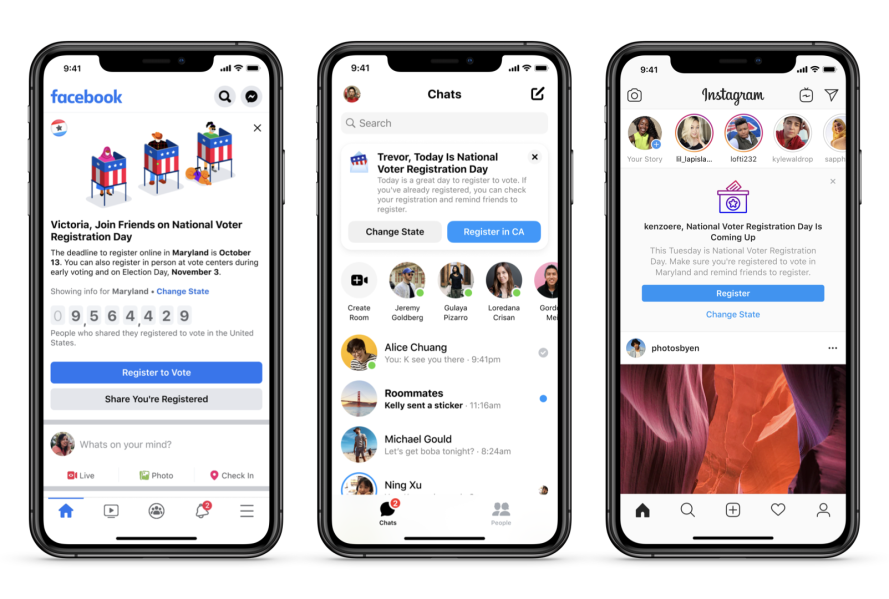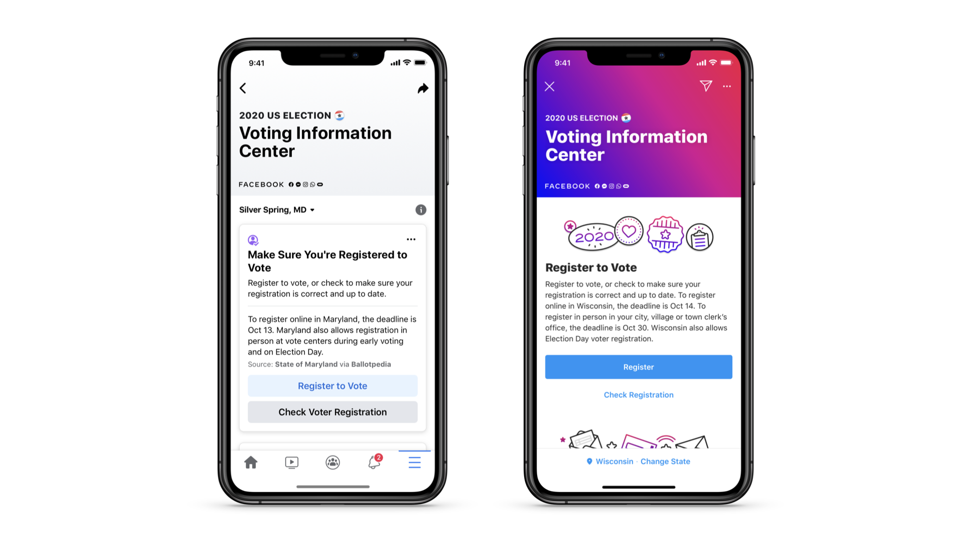 Since last Saturday, we’ve been showing people in the US information about how to register at the top of the Facebook, Instagram and Messenger apps. These notifications take them to the relevant page with their state’s official website or one of our non-partisan partner organizations if online voter registration isn’t available in their state. We’ll keep showing these notifications through September 25, building on previous top-of-feed registration drives we ran this summer.