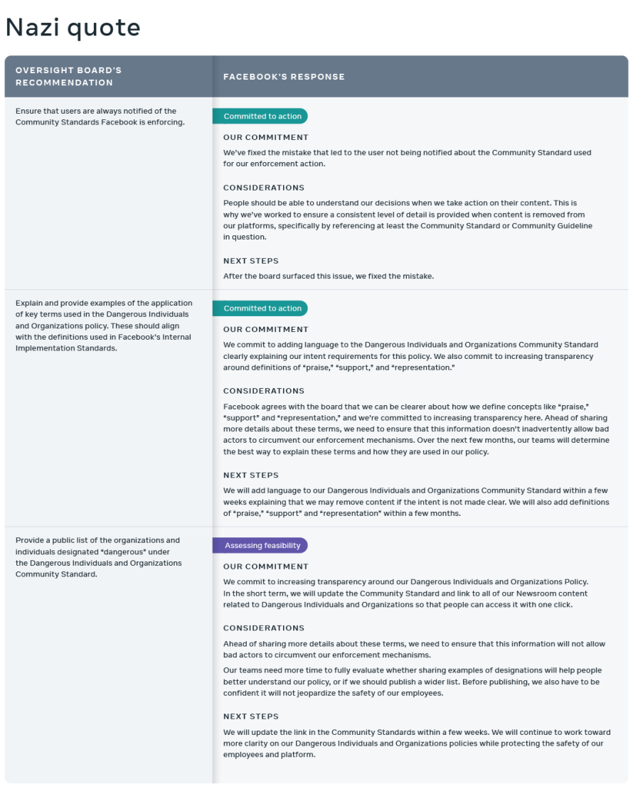 When the board issued their binding decision for this case last month, we immediately implemented their decision and reinstated the case content. At that time they also issued a series of non-binding recommendations which we are responding to in the table below. Simultaneously we’ve started the process of reinstating identical content with parallel context in line with the board’s decision. This action will affect not only content previously posted on Facebook but also future content.
