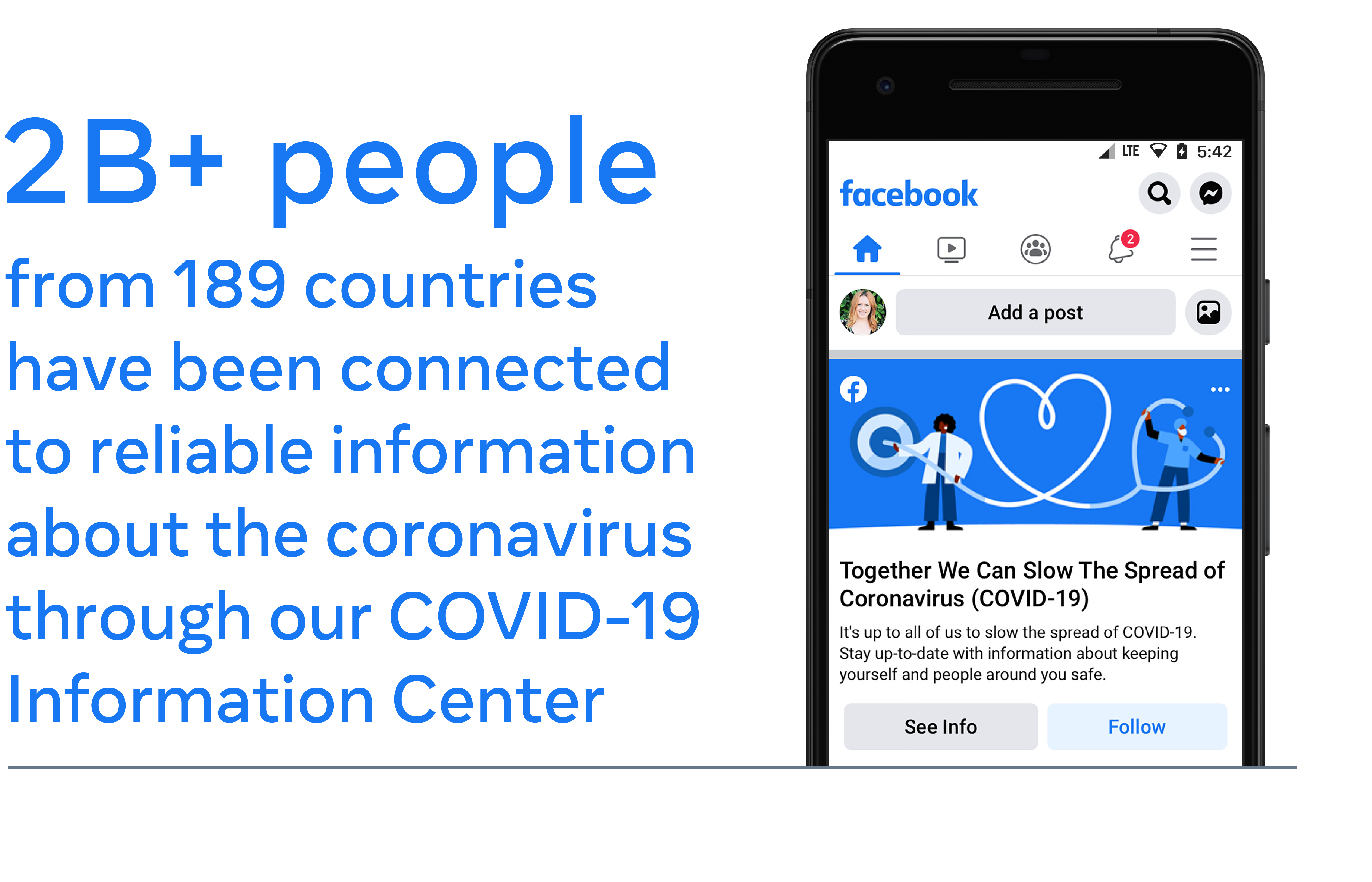 A year ago, COVID-19 was declared a public health emergency and since then, we’ve helped health authorities reach billions of people with accurate information and supported health and economic relief efforts. We’ve connected over 2 billion people from 189 countries to reliable information about the coronavirus through our COVID-19 Information Center and informational messages, and we’ve removed more than 12 million pieces of content on Facebook and Instagram containing misinformation that could lead to imminent physical harm. We’ve partnered with governments in more than 120 countries, as well as multilateral organizations like the World Health Organization (WHO) and UNICEF, to deliver timely information about COVID-19, including through helplines on WhatsApp.