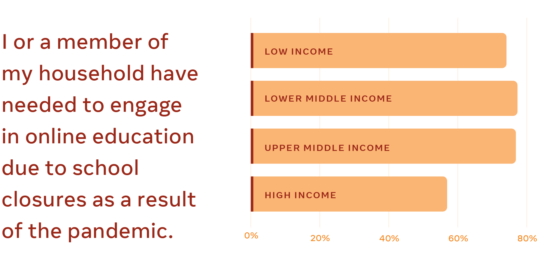 Regions of the world without widespread access to quality internet have become the most dependent upon it. People in low-income and lower-middle-income countries relied on online education during the pandemic more than those in wealthier countries, and predicted that they will continue to use online channels for education even after the pandemic has subsided. Yet schoolchildren in low- and lower-middle-income countries lost nearly 16 weeks of schooling by October 2020 due to the pandemic and significantly lower internet access and adoption, compared with only six weeks of loss in high-income countries.