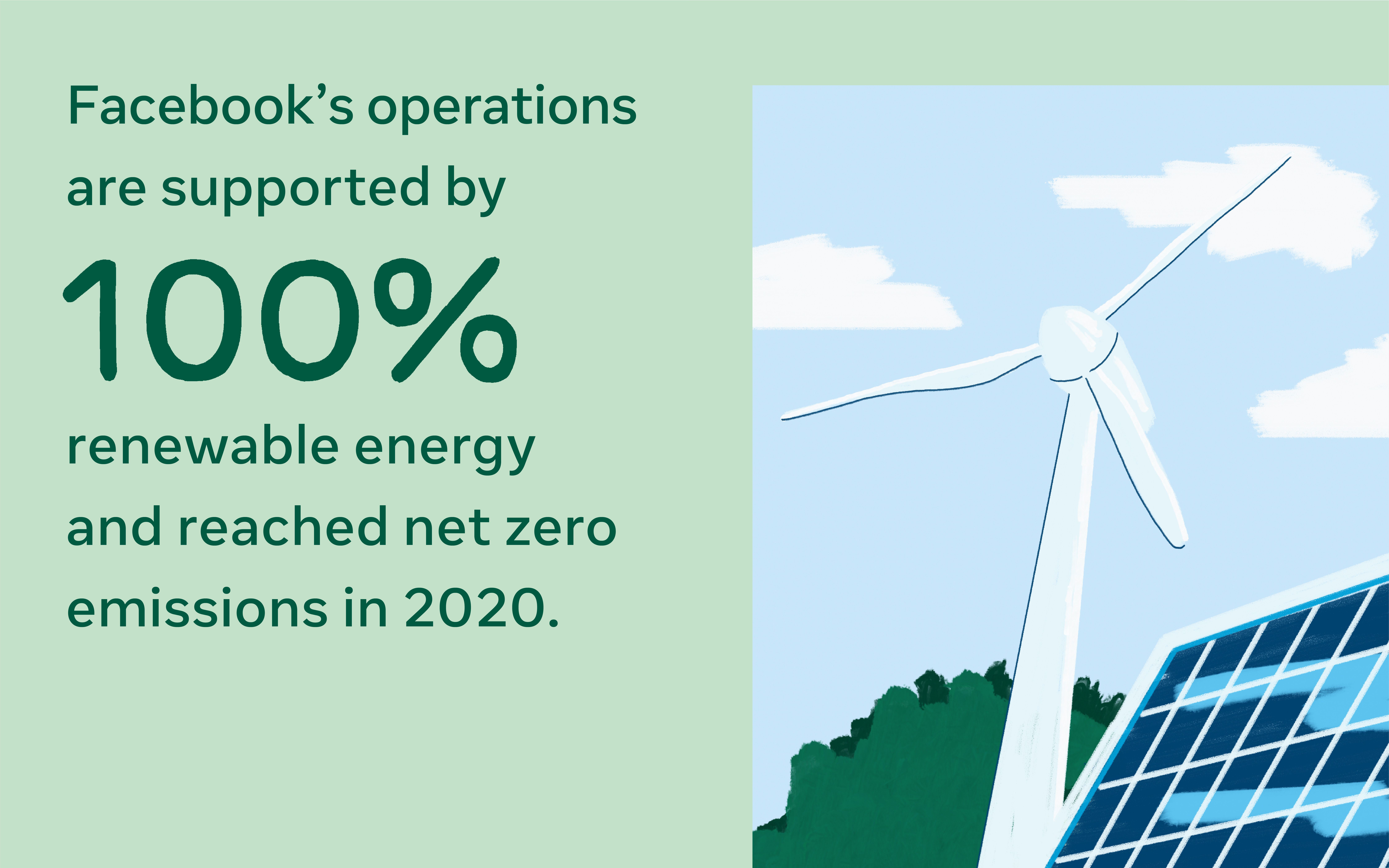 We recognize the urgency of climate change and have worked to reduce our company’s environmental footprint over the past 10 years. Today we’re announcing that as of 2020, Facebook’s operations are supported by 100% renewable energy and have reached net zero emissions. In just the last three years, we have reduced our greenhouse gas emissions by 94%, exceeding our 75% reduction goal.