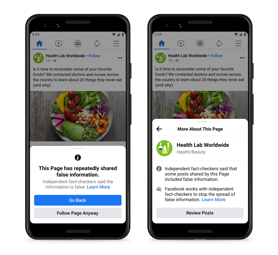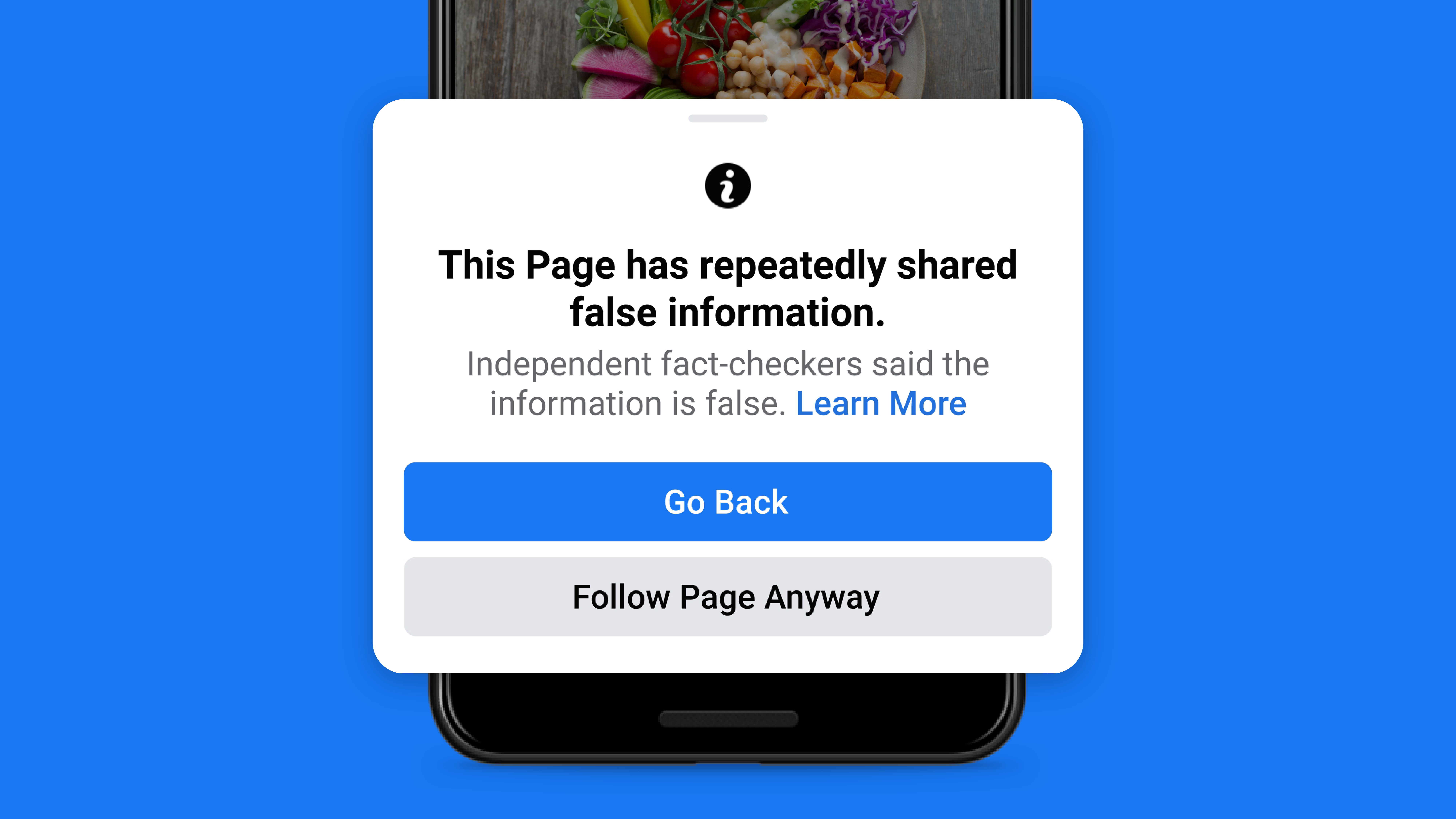 We want to give people more information before they like a Page that has repeatedly shared content that fact-checkers have rated, so you’ll see a pop up if you go to like one of these Pages. You can also click to learn more, including that fact-checkers said some posts shared by this Page include false information and a link to more information about our fact-checking program. This will help people make an informed decision about whether they want to follow the Page.