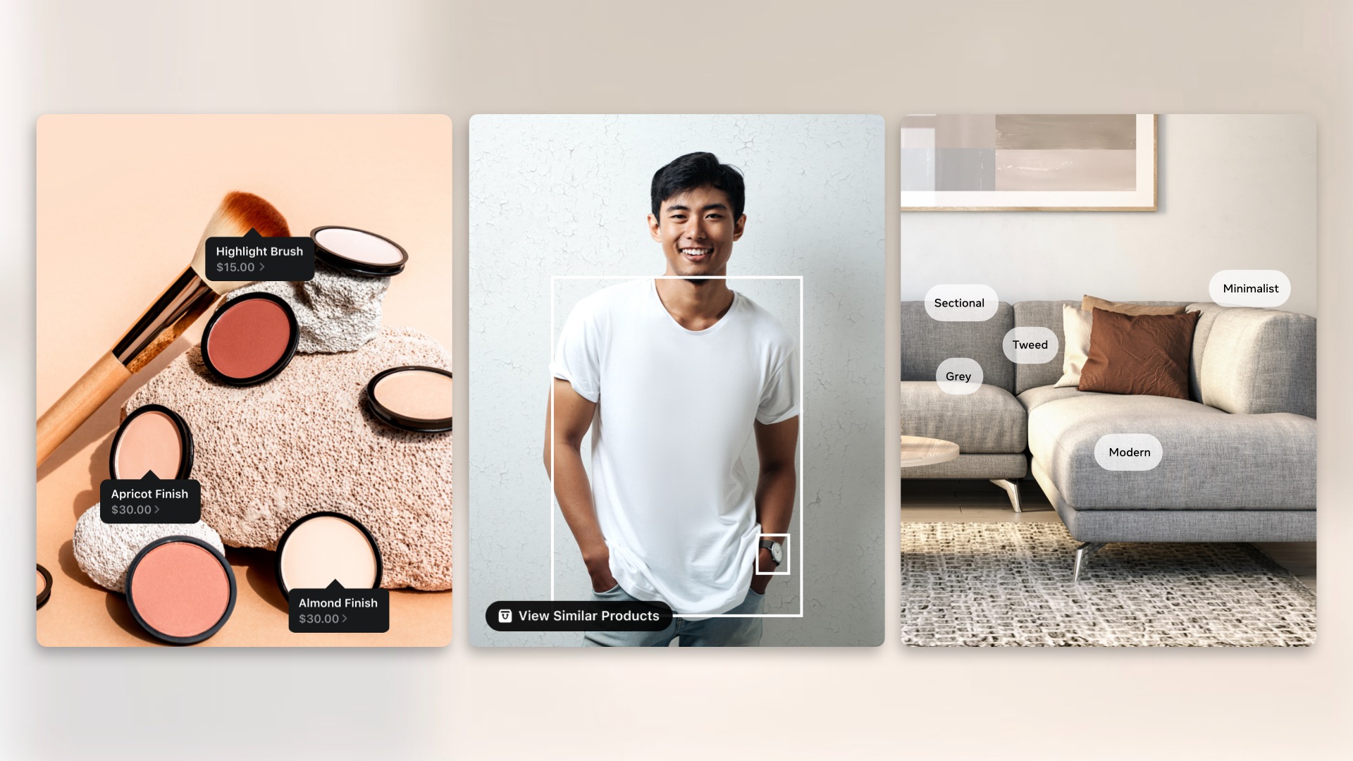 Since 2020, we’ve expanded this technology to new applications to make posts more shoppable across new Facebook applications. Right now, when a seller posts an image on their Facebook page, our AI-powered shopping system helps identify untagged items and suggests tags based on their product catalog — so that instead of taking several minutes to manually tag their items, a seller could create and post their photo in just seconds. And when a shopper is viewing an untagged post from a seller, the system instantly suggests similar products below the post from that seller’s product catalog.