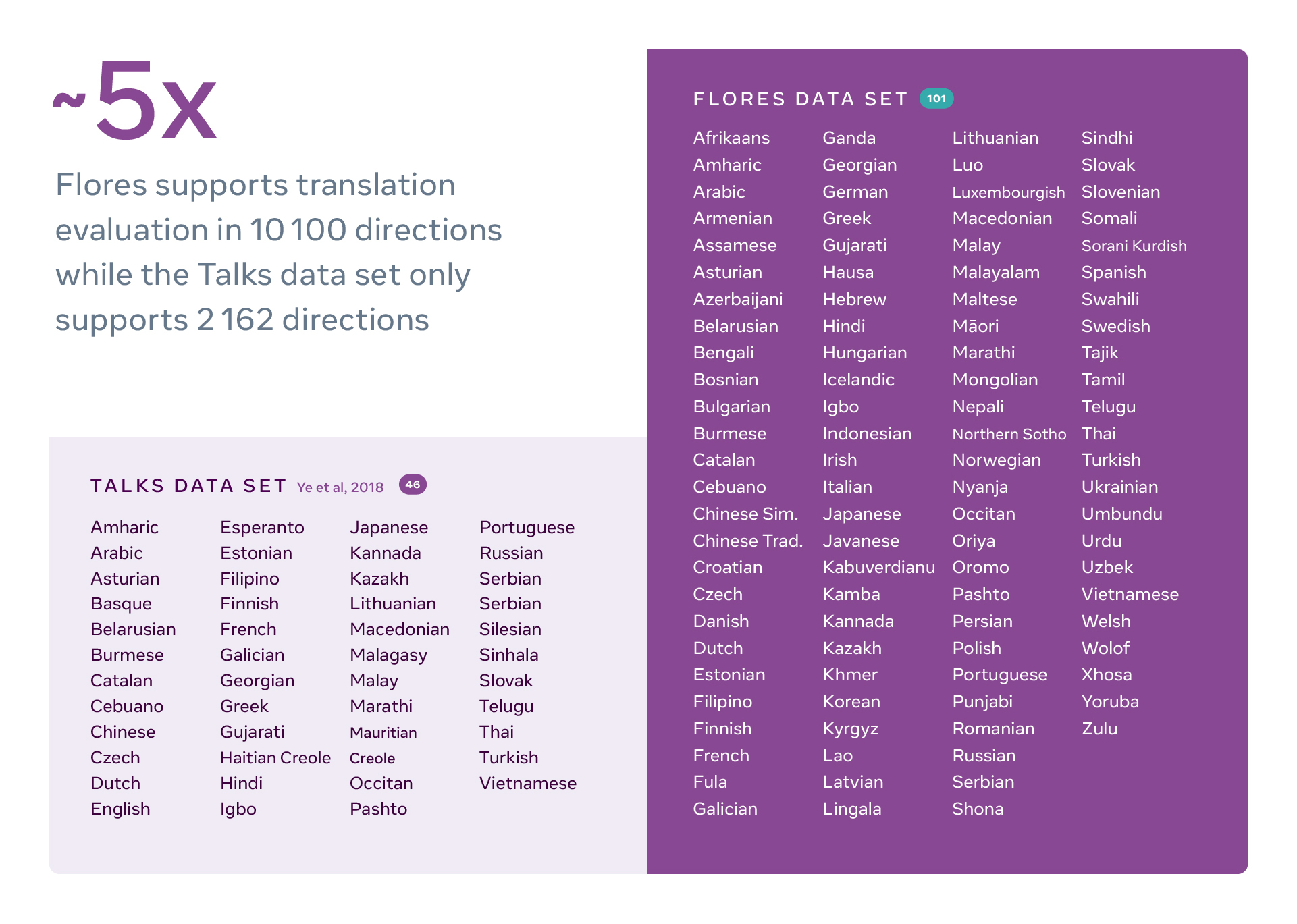 The flexibility exhibited by FLORES is possible because we designed around many-to-many translation from the start. The data set contains the same set of sentences across all languages, enabling researchers to evaluate the performance of any and all translation directions.