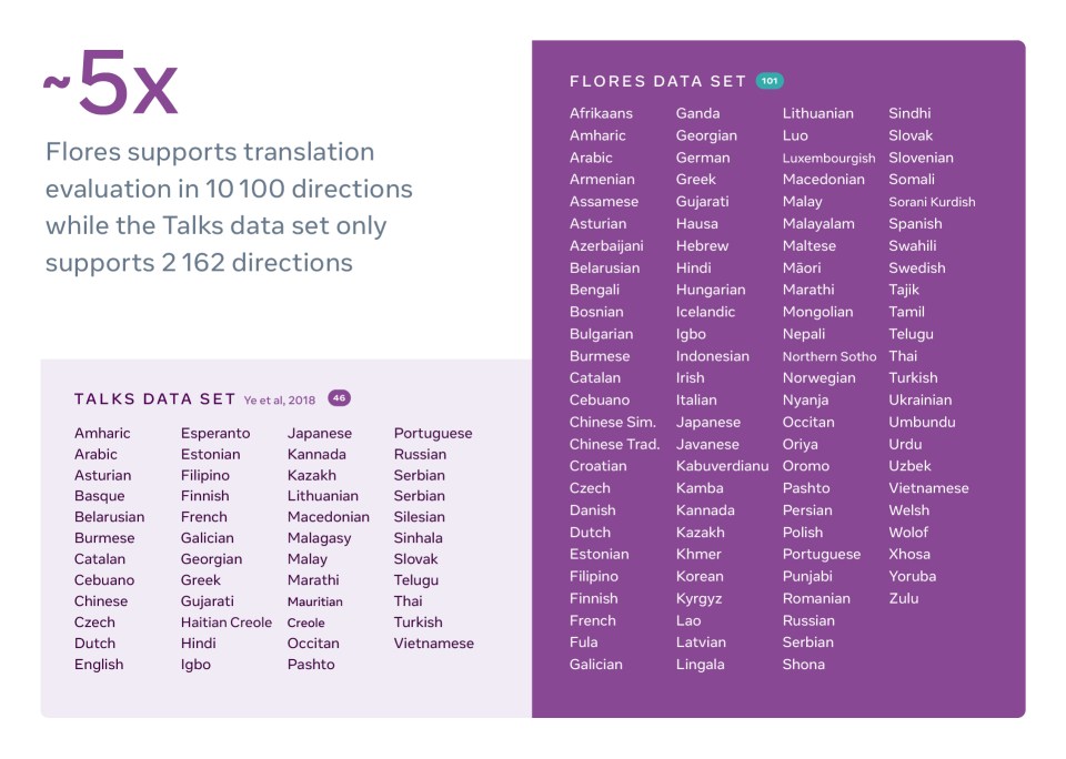 FLORES-101 focuses on what are known as low-resource languages, such as Amharic, Mongolian, and Urdu, which do not currently have extensive data sets for natural language processing research. For the first time, researchers will be able to reliably measure the quality of translations through 10,100 different translation directions — for example, directly from Hindi to Thai or Swahili. For context, evaluating in and out of English would provide merely 200 translation directions.