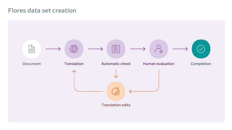 To create FLORES, each document was first translated by a professional translator, and then verified by a human editor. Next, it proceeded to the quality-control phase, including checks for spelling, grammar, punctuation, and formatting, and comparison with translations from commercial engines. After that, a different set of translators performed human evaluation, identifying errors across numerous categories including unnatural translation, register, and grammar. Based on the number and severity of the identified errors, the translations were either sent back for retranslation or — if they met quality standards — the translations were considered complete.