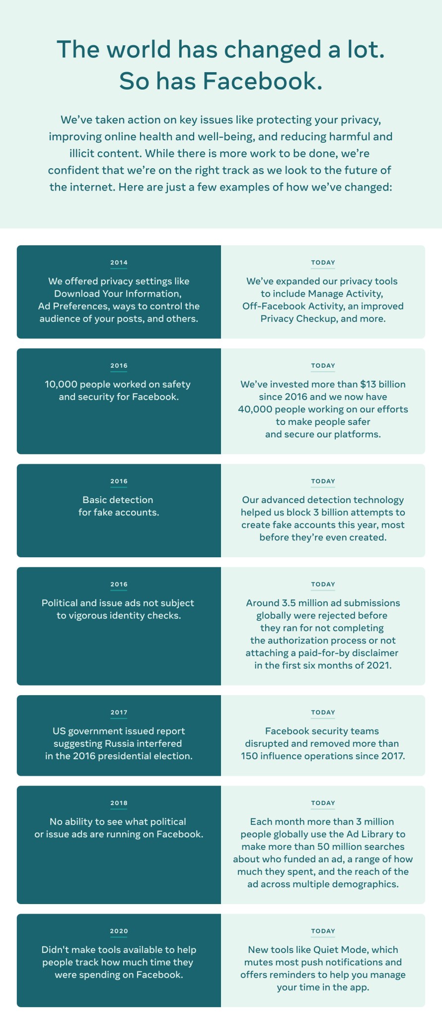 We firmly believe that ongoing research and candid conversations about our impact are some of the most effective ways to identify emerging issues and get ahead of them. This doesn’t mean we find and fix every problem right away. But because of this approach, together with other changes, we have made significant progress across a number of important areas, including privacy, safety and security, to name a few. Just as the world has changed a lot, so has Facebook.