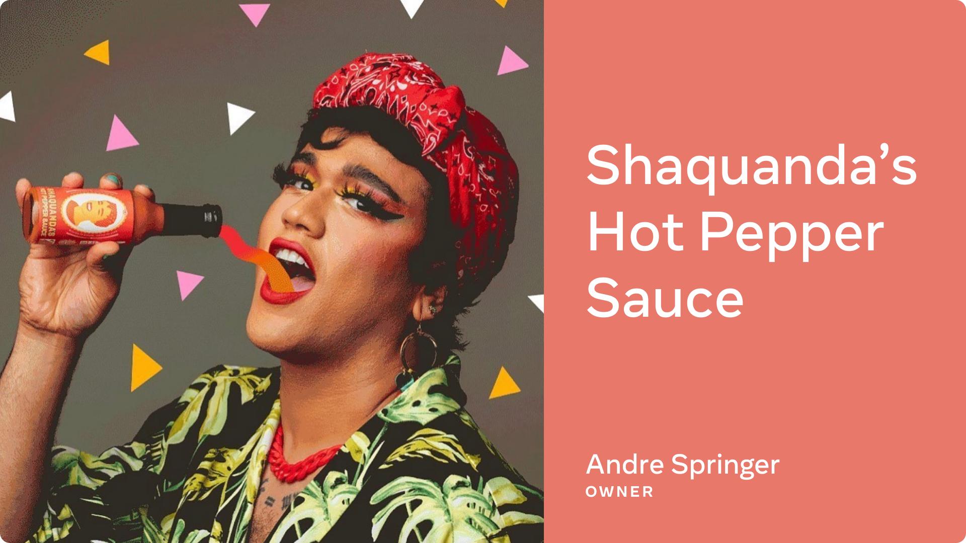 Shaquanda’s Hot Pepper Sauce, owned by Andre Springer, who started his business four years ago as an extension of his drag queen persona Shaquanda. It began as an art project with a friend to celebrate his Caribbean heritage. As part of the art piece, Andre labeled and put bottles in a shopping cart as an homage to his grandmother and sold out. Encouraged by the reception his delicious sauce received, Andre turned his performance into a business.