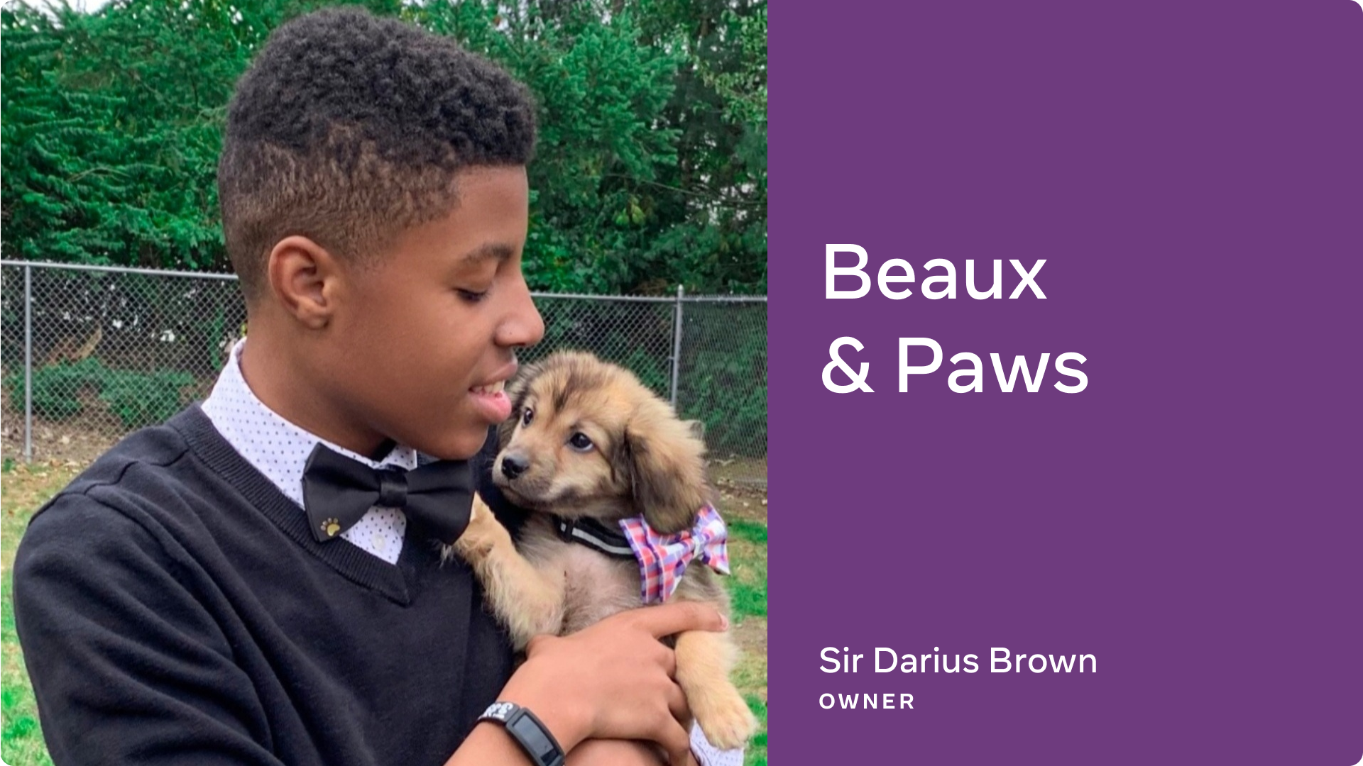 Beaux & Paws, owned by 15-year-old entrepreneur Sir Darius Brown who knew since an early age that he wanted to make stylish bow ties for both people and pets. When he was younger, he was diagnosed with speech and language issues. As he grew up, he saw his sister using a sewing machine to make bows. He loved them and started making his own bow ties, which also helped develop his motor skills. When Hurricane Harvey hit, Sir Darius made bow ties for pets to encourage people to adopt animals displaced by the storm.