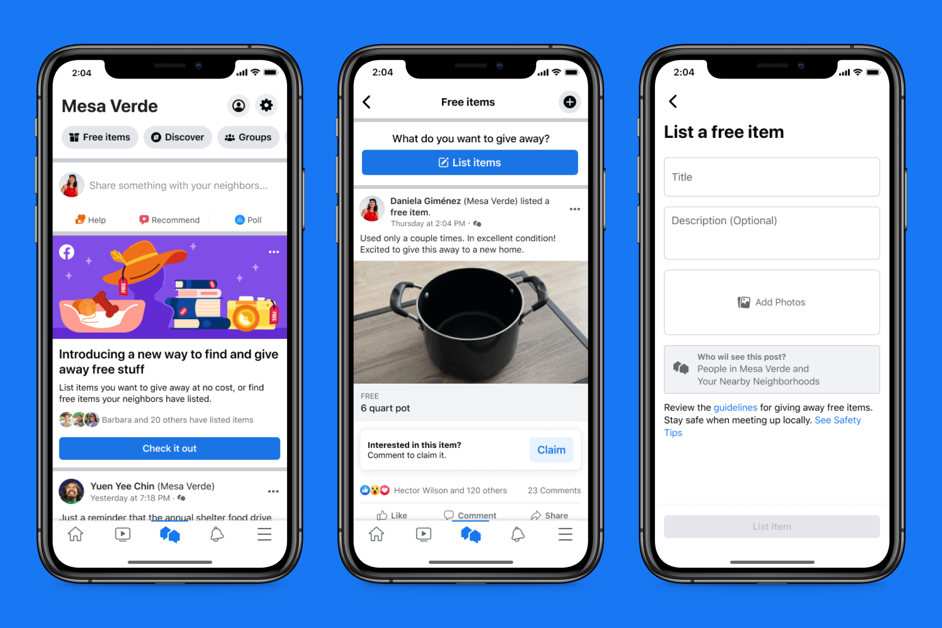 - We’re testing a new feature for people to offer free items on Facebook Neighborhoods.
