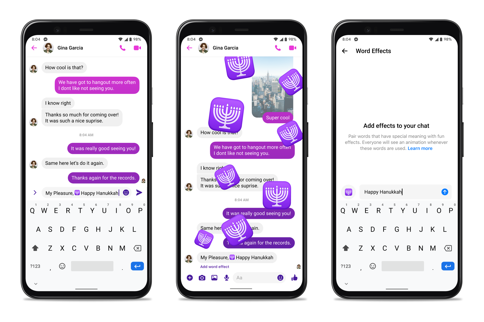 Chances are, you’ll be sending lots of messages over the holidays. To make spreading cheer easier and more fun, we’ve created suggested word effects in Messenger for wishing people a Merry Christmas, Happy Hanukkah and Happy Kwanzaa. You guessed it — these are the emojis that go along with the greetings: 🎄, 🕎 and 🕯. Add them to your chats when prompted to let everyone you’re messaging share in the joy.