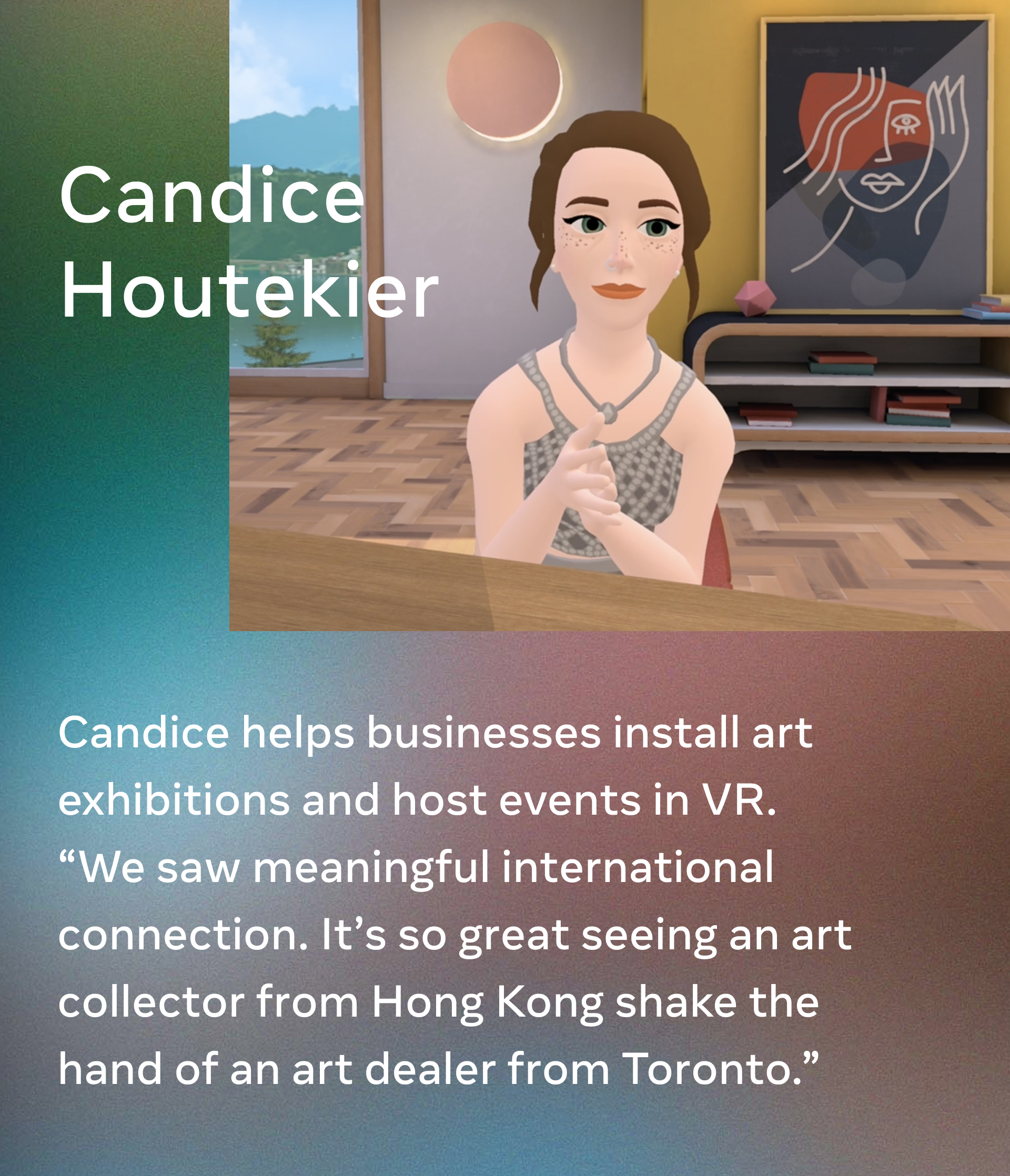 Born and raised in France, Candice Houtekier is the founder of Art Collision, a Toronto-based creative studio that helps organizations install art exhibitions and hosts events in VR. She has transformed the international art market by bringing artists and collectors into new realities. Because she imagines every industry to be in the metaverse in the future, she envisions a healthy ecosystem where all businesses can thrive. She hopes that the metaverse will become synchronized to financial systems so businesses and creators can sell virtual goods more easily.