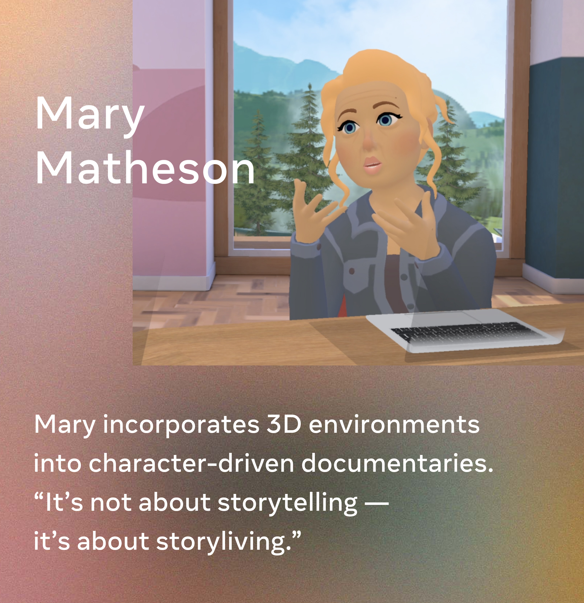 Mary Matheson is a British director who incorporates 3D environments into her documentaries to bring the audience a step deeper into the story. She co-creates with the protagonists themselves to ensure they feel represented properly. May is the lead director of the 10-part 360° New Realities VR Series 10 Young Women 10 Countries, which explores the stories of young female activists. While Mary is still often the only female on a male-donimated set, she’s determined to lift other women up in the metaverse and set more equitable ground rules. Mary will help raise the next generation of immersive creators as a professor at Arizona State University’s new Center for Narrative and Emerging Media in Los Angeles.