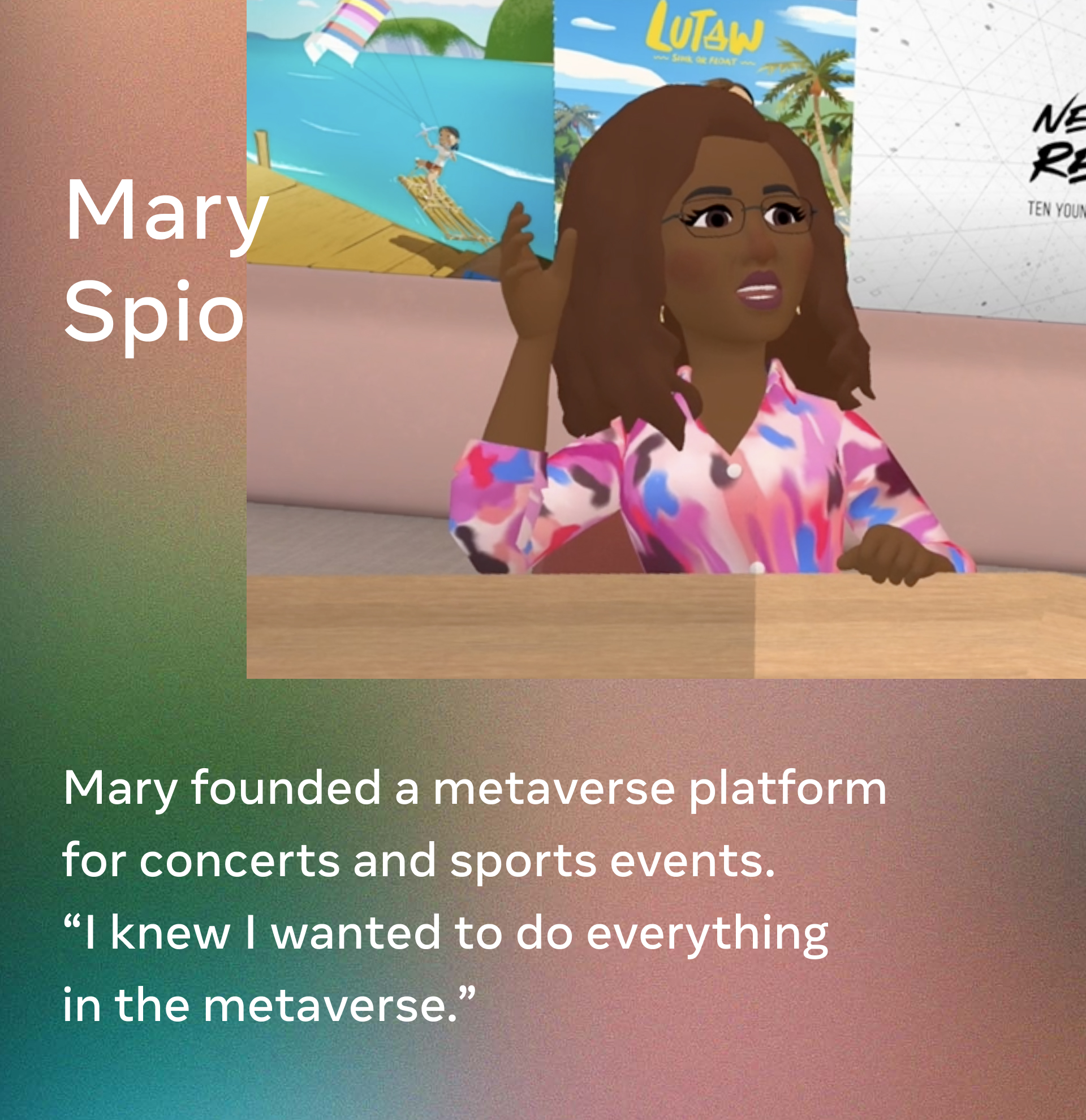 Space engineer and Founder of CEEK Mary Spio grew up in Ghana during a tumultuous time and escaped the chaos by watching space exploration on TV. Several years ago, when Mary first put on an Oculus headset as a space engineer, she was brought back to her childhood and wanted to give others the same sensory experience. Her dream was to see concerts and sports events through this new lens, so she founded CEEK, a metaverse platform for entertainment featuring Lady Gaga, Demi Lovato and more. During the COVID-19 pandemic, Mary was moved by how many frontline workers and cancer patients in hospitals used CEEK to watch concerts and practice mindfulness. With the rules of the metaverse being written right now, she finds this is the perfect time for women to join.