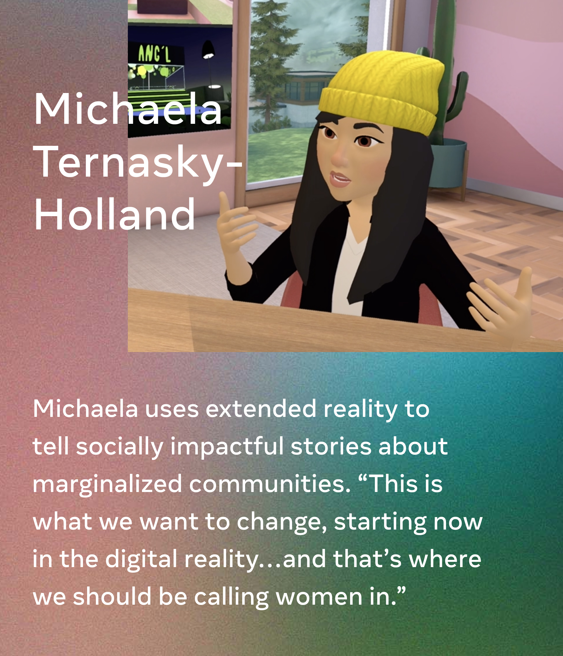 Yellow beanies, wire-rimmed glasses and platinum white hair are just some of the ways the women in our second Metaverse Culture Series experience represented themselves as avatars. Meta’s Chief Diversity Officer Maxine Williams sat with five female VR creators in Horizon Workrooms to discuss how their work and creative vision are shaping the future of the metaverse today, including Ang’l Artiste, Candice Houtekier, Mary Matheson, Mary Spio and Michaela Ternasky-Holland. Using immersive technologies to create art, build community and conduct business, these innovators are paving a path for other women around the world to explore what’s possible as we build toward the metaverse.